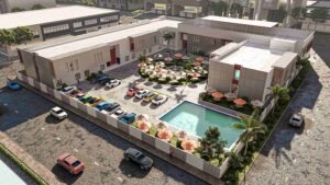 Composante: Ce projet comprend un total de 54 chambres, dont 25 suites, un restaurant, un espace plein air autour d’un jet d’eau pour les réceptions de mariage, un jardin entourant une grande piscine (150 m2), un espace coworking, un supermarché, une boulangerie, une pharmacie et un magasin, le tout sur une emprise de 4000 m2.